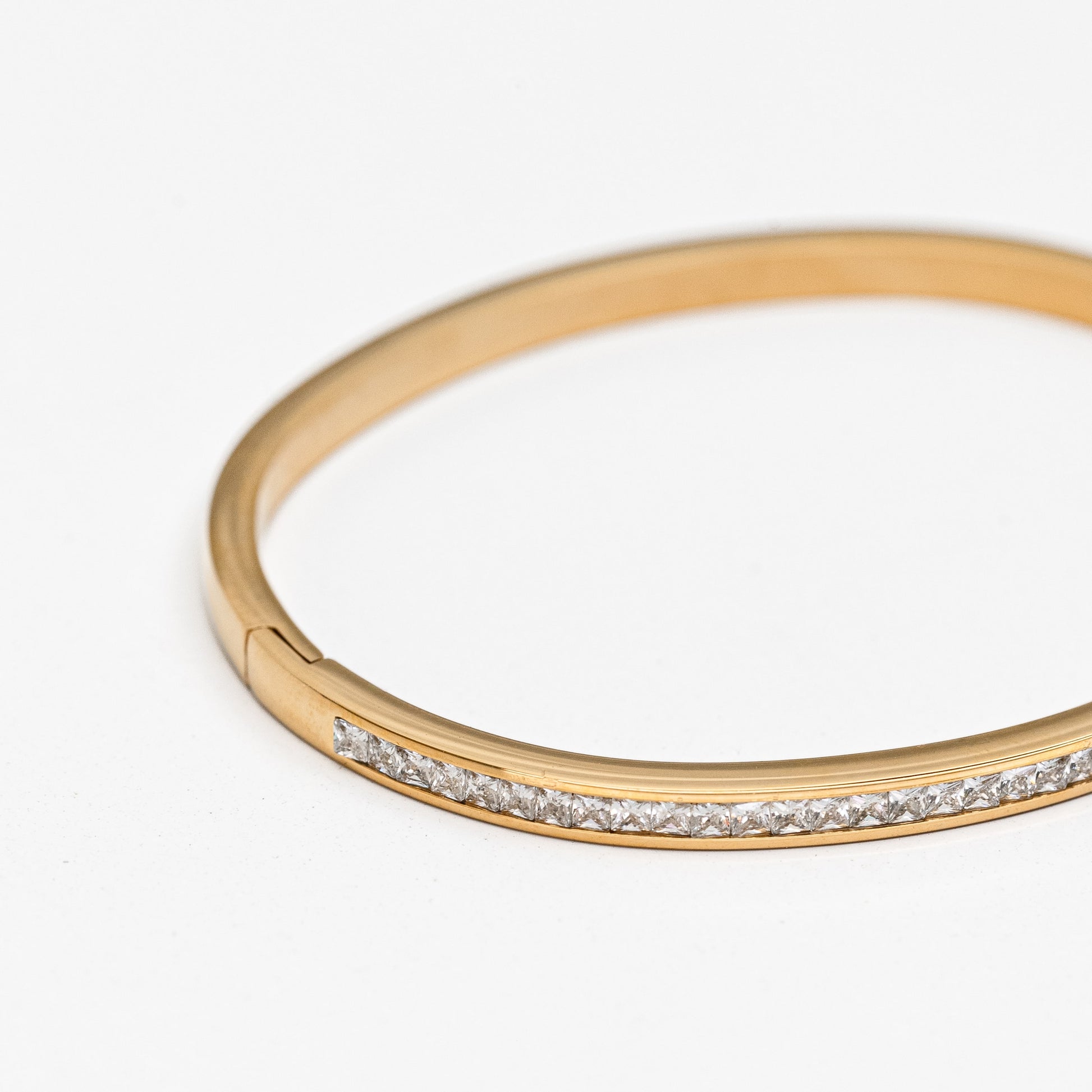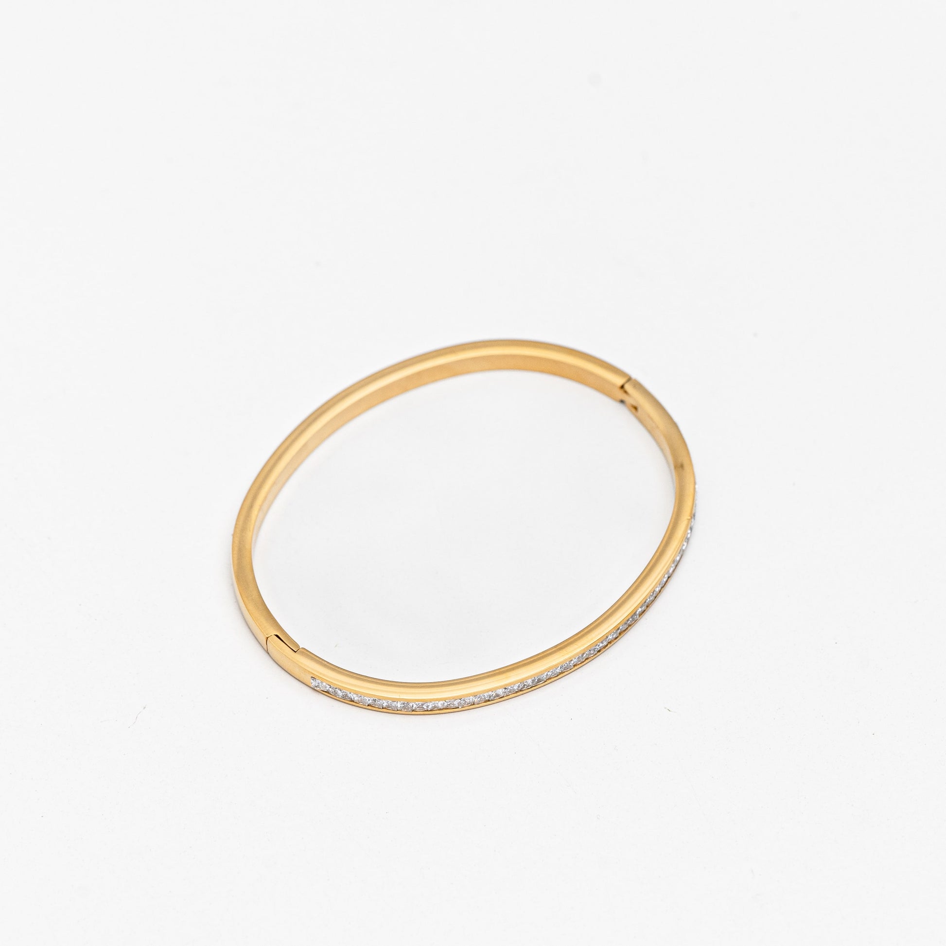 A sleek gold-plated stainless steel bangle elevated with a delicate line of diamond-style stones that catch the light with every movement. Modern, refined, and effortlessly elegant, this piece adds a touch of luxury to any wrist, whether worn alone or stacked for a bolder shine.