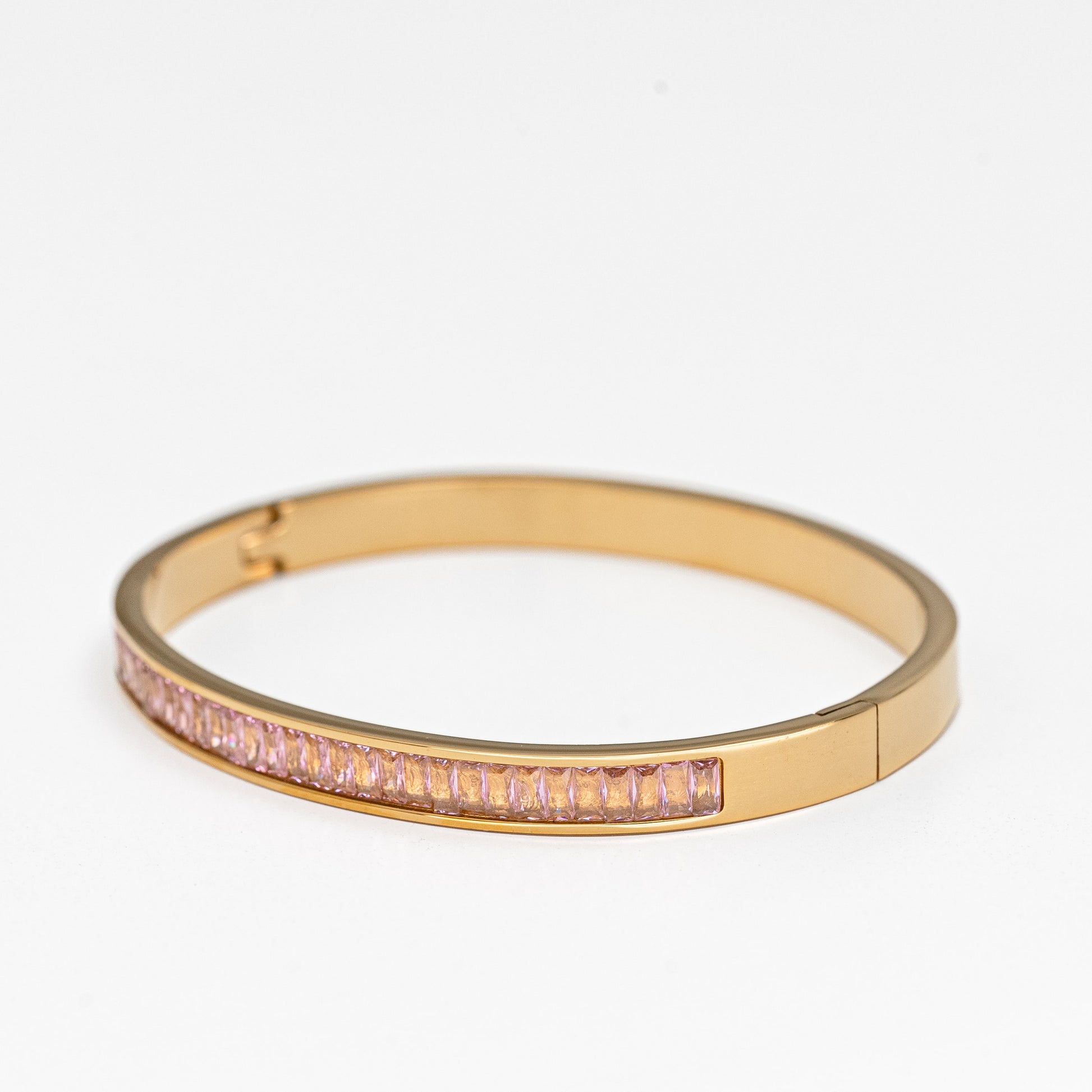 A refined gold-plated stainless steel bangle adorned with soft pink stones that catch the light with every movement.